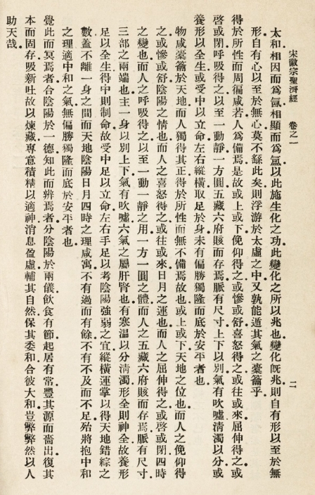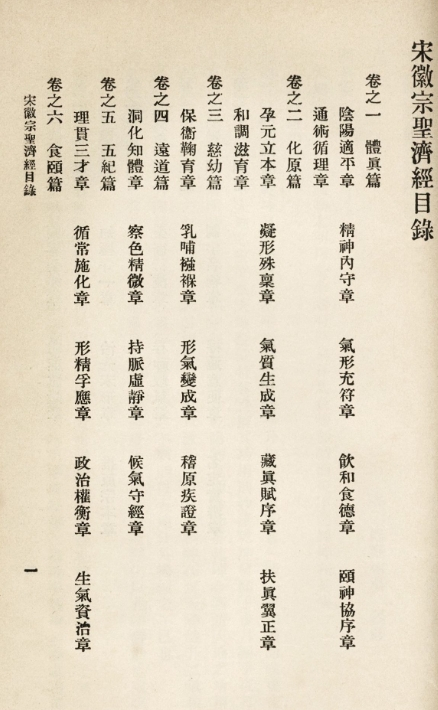宋徽宗赵佶撰于北宋政和八年(1118)。全书分体真、化原、慈幼、达道、正纪、食颐、守机、卫生、药理、审剂10篇,以阐述《素问》要义为主。论及阴阳五行、运气、体质、色脉诊、药物、方剂、养生、食疗、气功、孕妇养护、婴儿养护及各种病证等。吴氏注文,对此阐析颇详,较切实用。